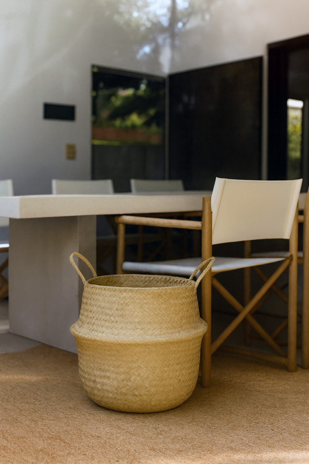 Handcrafted woven seagrass large basket with dual leather handles, perfect for storage, plant display, or bohemian home décor