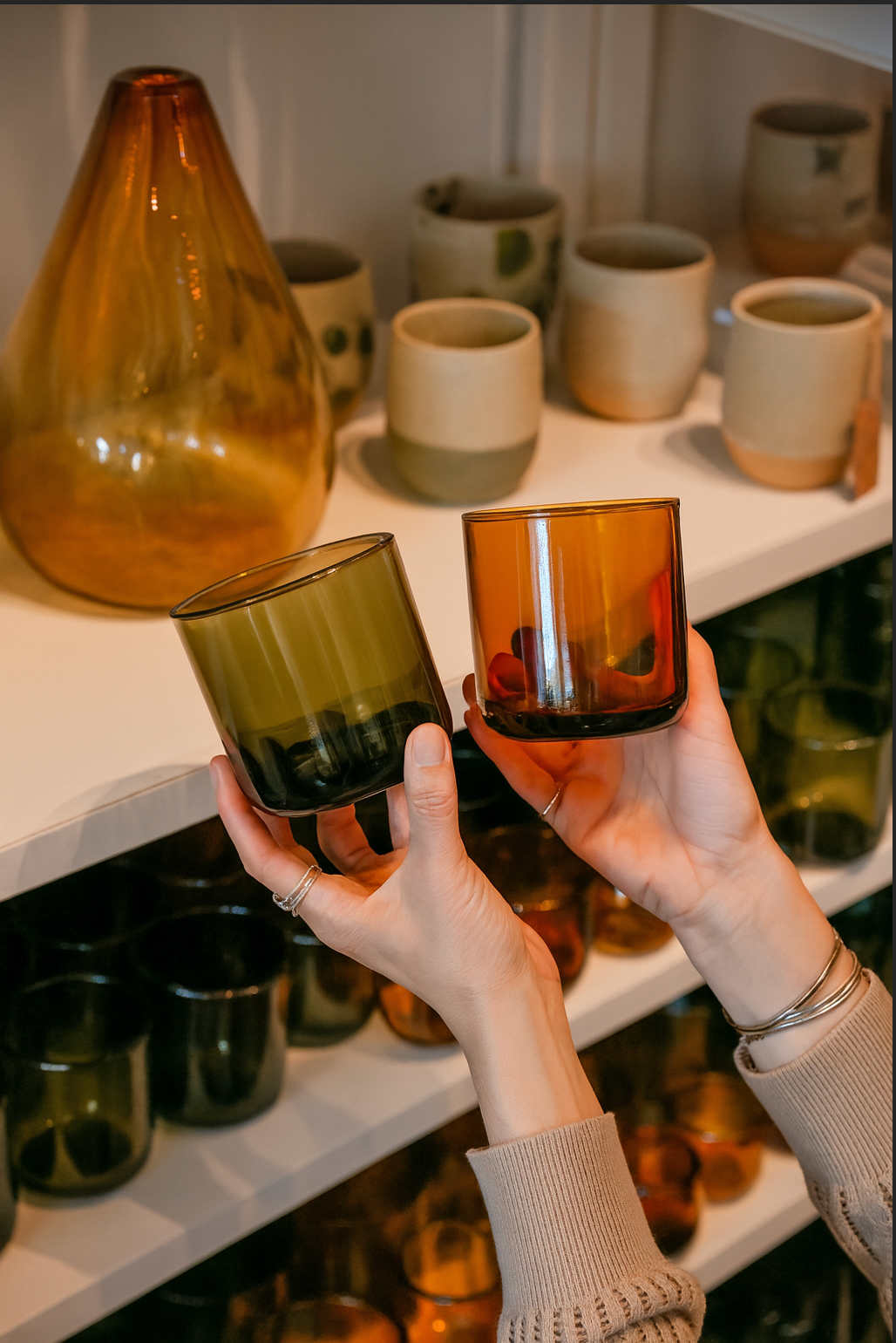 Handcrafted glass in smoke green with elegant tapered design, perfect for water, cocktails, or as a stylish addition to glassware collections